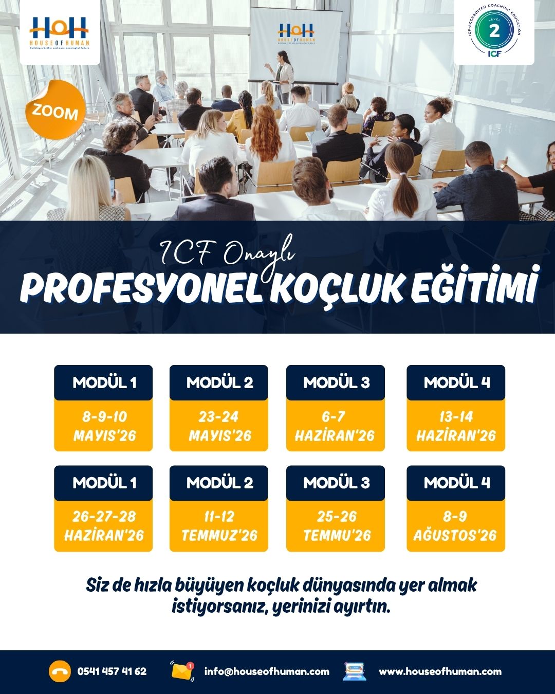 House of Human, Amerika merkezli Uluslararası Koçluk Federasyonundan (ICF); ACSTH onayı alan ilk kurumdur. Bugüne kadar uluslararası onaylı 6 farklı kursun sahibidir. Her biri sektöründe üst düzey görevlerde bulunmuş, muhtelif başarılar kazanmış Profesyonellerden oluşan eğitmen kadrosuyla teorinin ötesine geçerek pratikte uygulanan yöntemleri paylaşarak fark yaratmaktadır. Yayınladığı 3 kitap ile koçluğu desteklemektedir (Koçluk Araçları, Profesyonel Koçluk, Mutluluk).